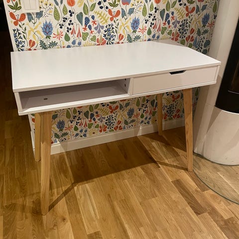Skrivbordet har en praktisk låda för förvaring. Det finns en liten repa i ett hörn, men i övrigt är bordet i mycket gott skick.