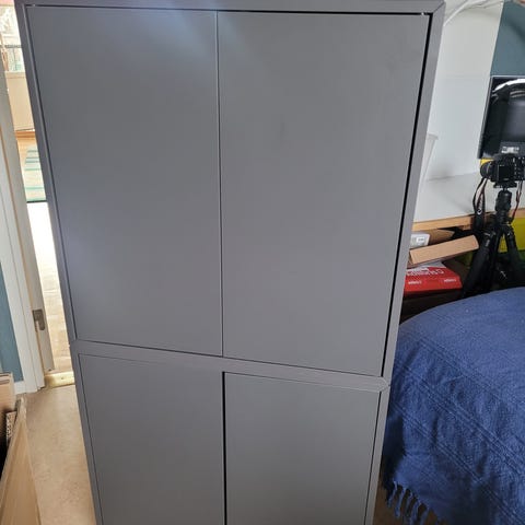 Inköpta nyligen i andra hand. Hade planer på att använda de som klädförvaring men upplevde lådorna som för små. En del av skåpen är målade med en gul färg men målningen är inte helt färdig och den vita grundfärgen lyser igenom. Alla säljs därför billigt.