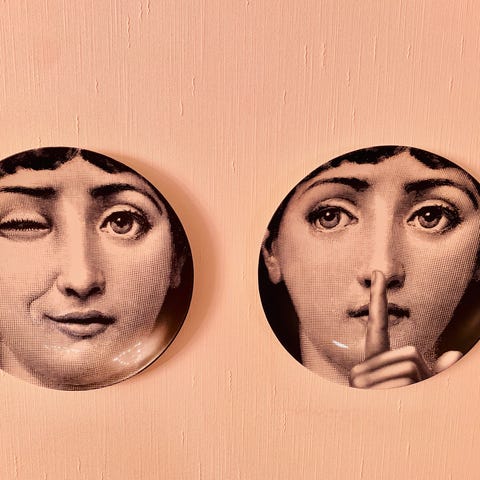 Fornasetti tallrikar set bestående av 4 delar i svartvitt porslin. Varje tallrik har ett unikt ansiktsmotiv med olika uttryck. De är dekorativa och kan användas för prydnad eller som samlarobjekt.