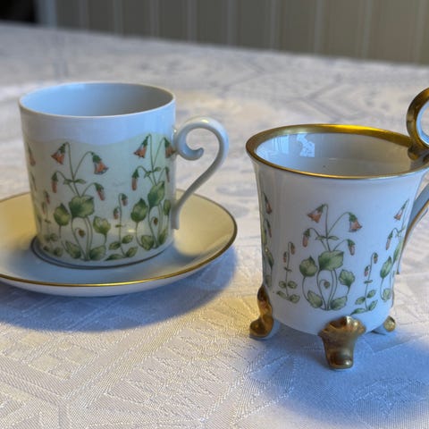 Hackefors Viol med 12 koppar, fat och assietter. I servisen ingår också sockerskål och grädd-/mjölkkanna. Även två vackra uppläggningsfat ingår. Servisen är aldrig använd!
