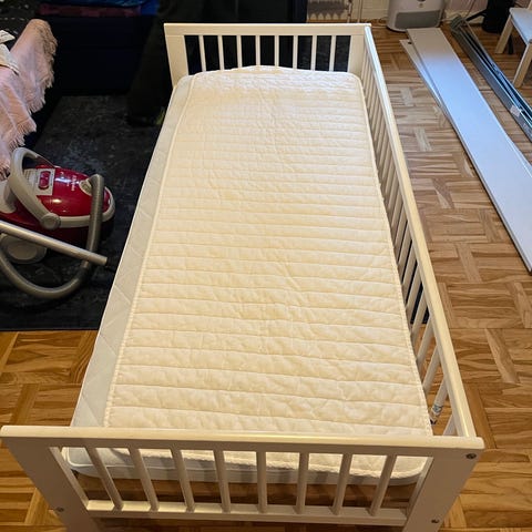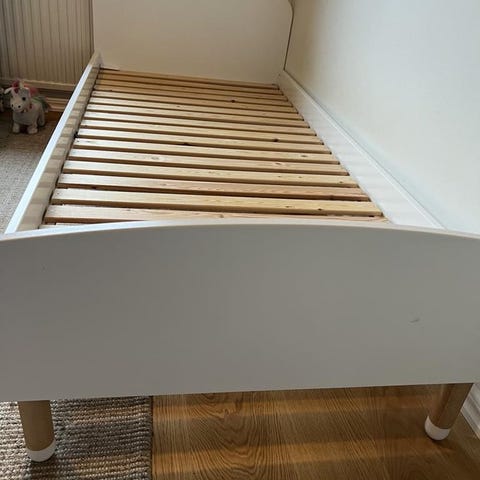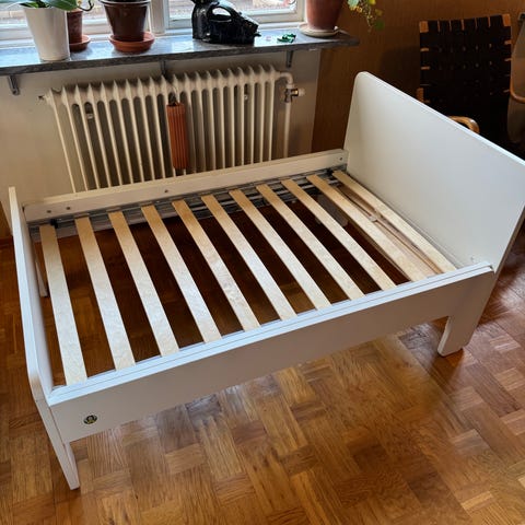 Juniorsäng i vitt trä, flexibel växa säng från (80x130 till 80X210) Sparsamt använd köpt på Sleepo för 8000 möjlighet att kompletteras med olika textilier och kuddar efter behov. Nu 1500!