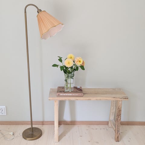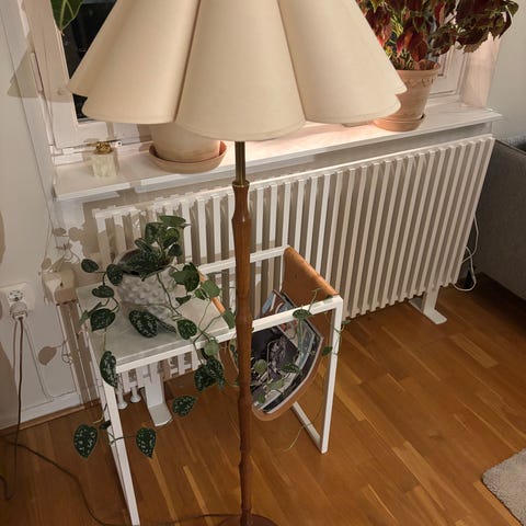 Golvlampans stomme och fot är gjord i trä. Foten har också små metallfötter. Skärmen form är oval och klädd i tyg med en guldbård. Två vanliga glödlampor går att använda.