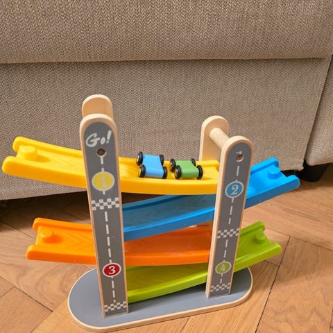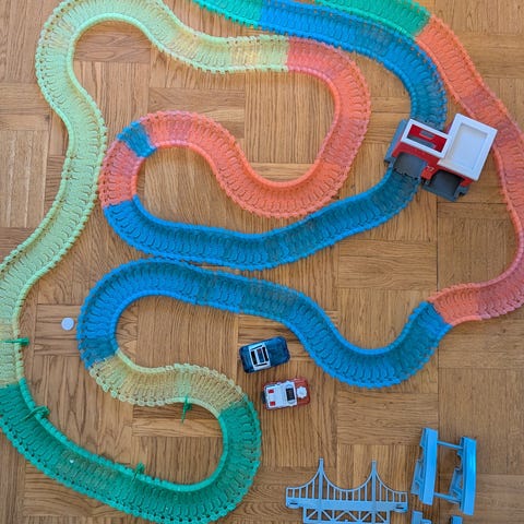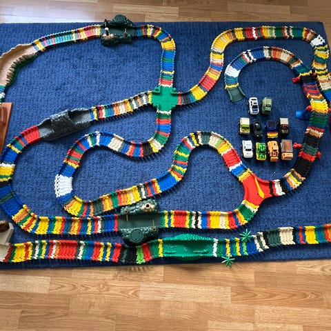 Bilbana som enkelt byggs ihop mha små plastbitar som klickas i varandra. Kan byggas i hop i olika färger och kombinationer (flexibana). Två vägkorsningar kan koppas ihop med banan. Orange korsning saknar en del av fästet på en av de tre utfarterna. Påverkar inte banan i sig men vägen sitter inte ”klick-fast” i korsningen när den delen används.