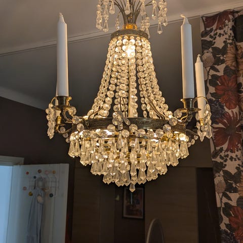 Slipade prismor som bryter ljuset i små regnbågar. Ringformad ”korg” med hängande kristallkedjor.