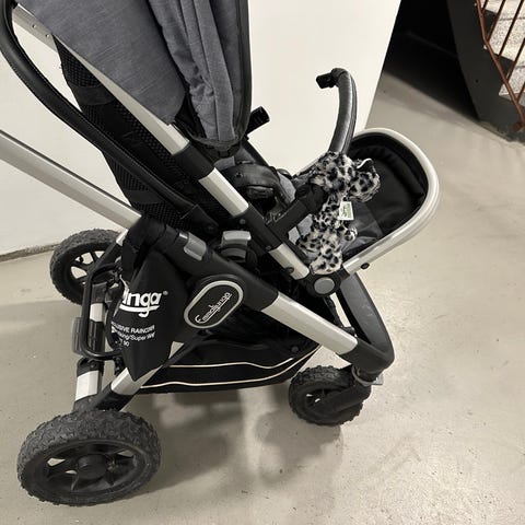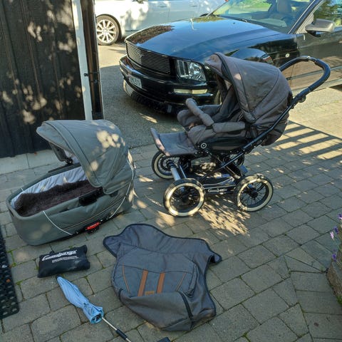 Mycket tillbehör ingår som ståbräda, regnskydd till båda delarna, myggnät, retro sele, retro filt, retro sittdyna mm.