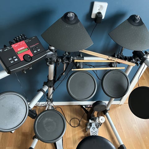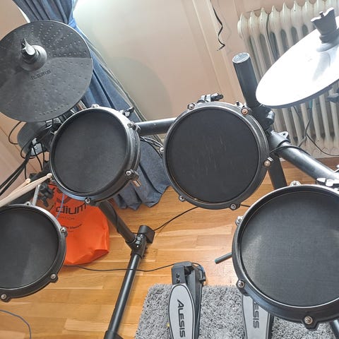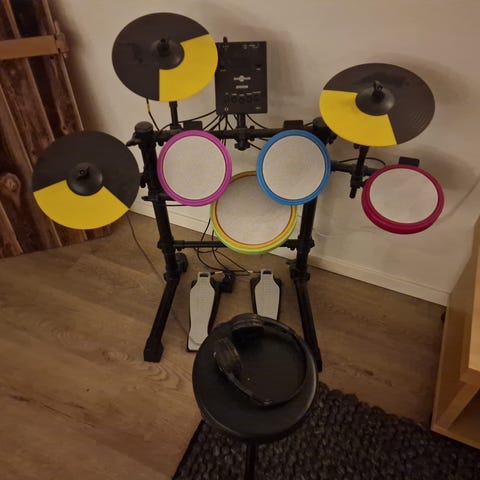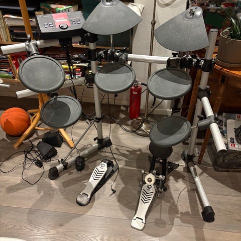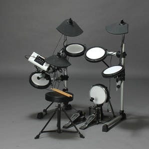 Elektroniskt trumset med flera trummor, cymbaler och två pedaler. Trumsetet är konstruerat för att användas med trumstockar och har en ram som håller trummorna och cymbalerna på plats. Höj-och sänkbar pall ingår. Trumsetet går att montera ner inför frakt.