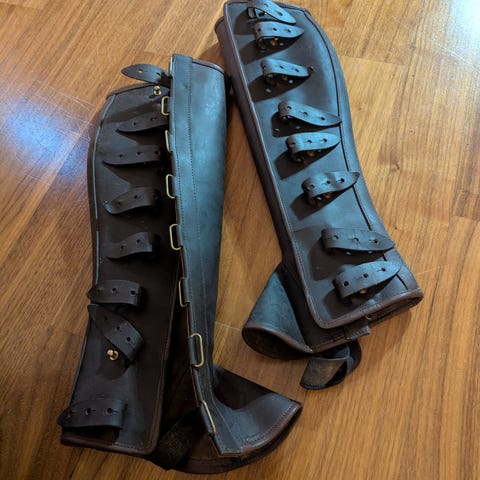 Klassiska MC-chaps med dragkedjor längs benen, midjefäste och fotrem.