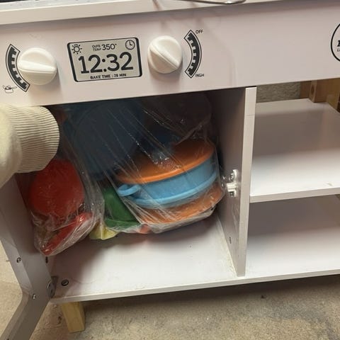 Leksakskök i trä med spis, ugn och diskho. Inkluderar olika köksredskap och leksaksmat som grönsaker, frukt, drycker och förpackningar. Lämpligt för barnlek och rollspel i köksmiljö.
