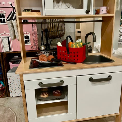 Leksakskök från Stoy med många tillbehör, leksaksmat och en kundkorg.