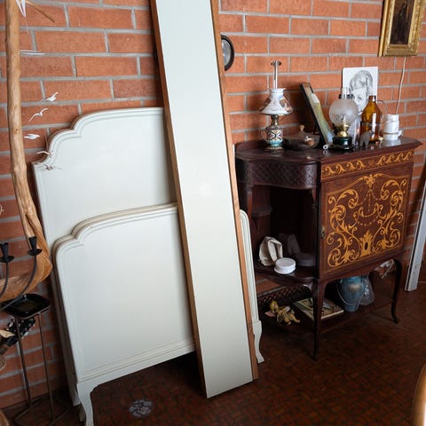 Vacker Typ antik sänggavel i trä att skruvas fast. Hål är borrade mellan två till tre cm från bottenkanten.