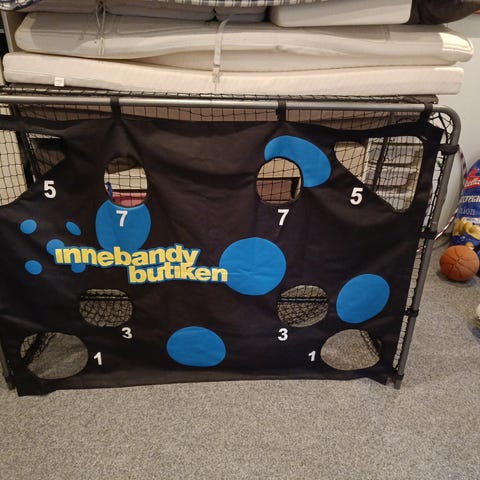 Ball buster innebandymål. Målet har en röd ram och ett nät med flera hål för poängräkning, iPassar för träning och spel med boll.