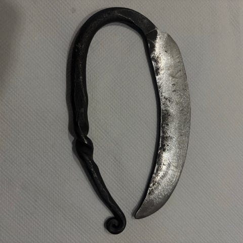 Handgjord sax i metall med unikt handtag i form av en hjärtform. Verktyget är avsett för klippning och har en rustik design. Saknar specifika märkesuppgifter.