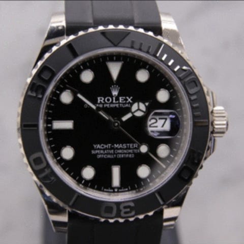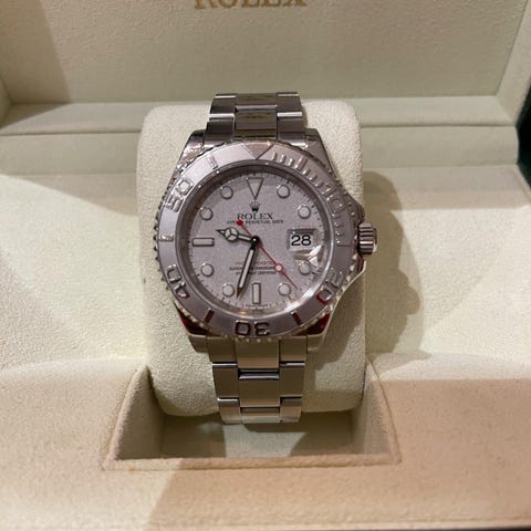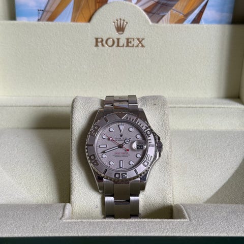 Rolex Yacht-Master herrklocka med rostfritt stål. Klockan har en rund urtavla med datumvisning och en roterande bezel. Designad för män.