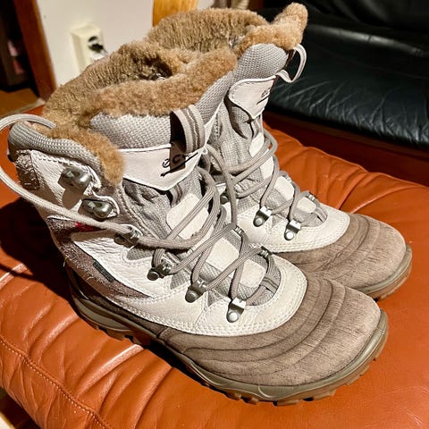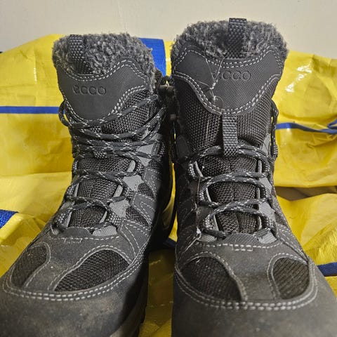 ECCO vinterskor i storlek 40, svarta. Skorna är avsedda för vinterbruk och har snörning framtill. Materialet är läder med en varm insida för komfort vid kallt väder.