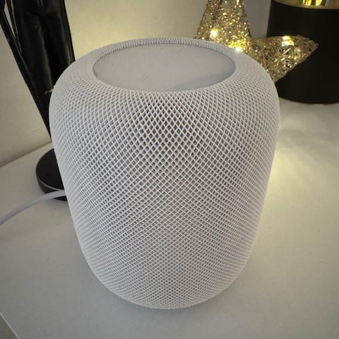 Google Home smart högtalare i vit färg. En enhet för röststyrning och smarta hemfunktioner med inbyggd högtalare och mikrofon.