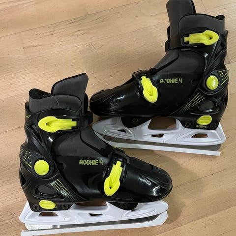 skridskor i barnstorlek 30-33 ställbara Skorna har justerbara remmar och kombinerar grått, vitt och orange i designen.