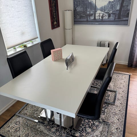 Bordet är i massiv ek med svart stenskiva i mitten 140x90x75. (L, B, H)