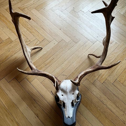 DRYCKESHORN, ett par, horn och nysilver, 1800-talets slut. Fötter i form av grenar, lock med knopp i form av hjorthuvuden. Höjd 37-39 cm. Slitage, mindre skador. Nysilver nött. Ett horn saknas. En bägare lös med bucklor. Inköpta på Bukowskis. 4.000:- +25% slagavgift var utropspris. Säljs privat.