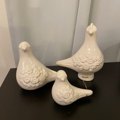 Set med tre glasfåglar i grönt och klart glas. Varje fågel har en unik form med detaljerade vingar och kroppar. Dekorativa föremål för inredning. 600 kr för alla 3.