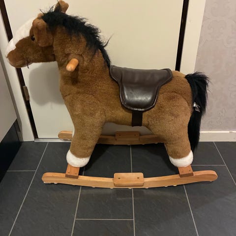 Gung häst i mjukt material med brunt foder och sadel. Leksaken är utformad för barn och har handtag för att hålla i samt en gungande bas i trä. Det finns även ljud när man trycker på det ena örat.