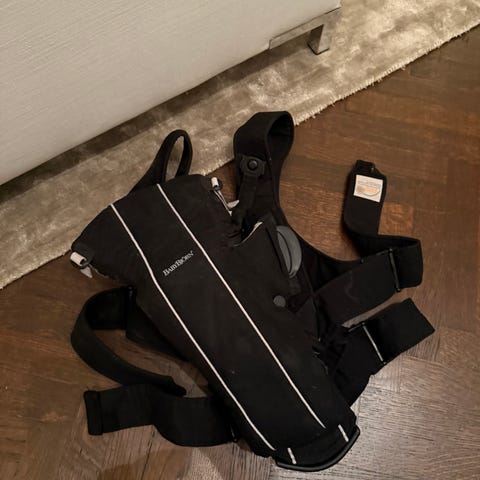 BabyBjörn One bärsele i svart med rosa detaljer. Bärselen är anpassad för barn från 3,5 kg upp till 12 kg. Den har justerbara remmar och är utformad för att ge stöd och komfort vid bärande av barnet.