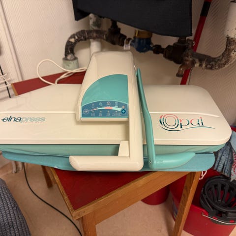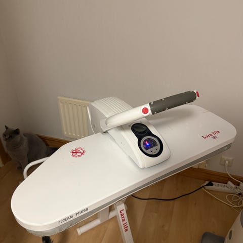 Elna strykjärn med pressyta. Vit och svart färg. Används för att pressa och stryka kläder och tyg.