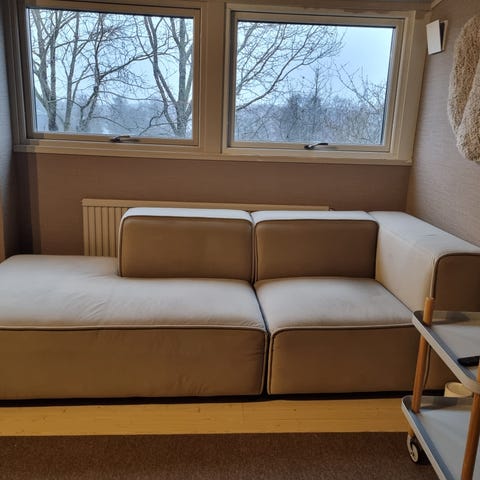 Gråa fotpallen: 97 cm B, 90 cm L, 40 cm H, 1000kr