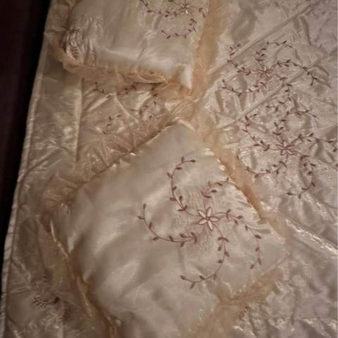 Helt nytt och jättefint täcke- och överkastset med 8 delar för olika kuddar samt en matta som passar under sängen.