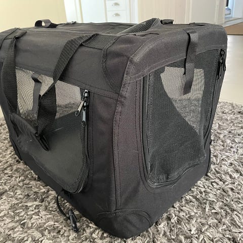 En fin och mycket lite använd hundbur för liten hund eller katter, bra att kunna öppna och stänga gardiner om man ska ha t.ex på utställningar eller på semester/camping.