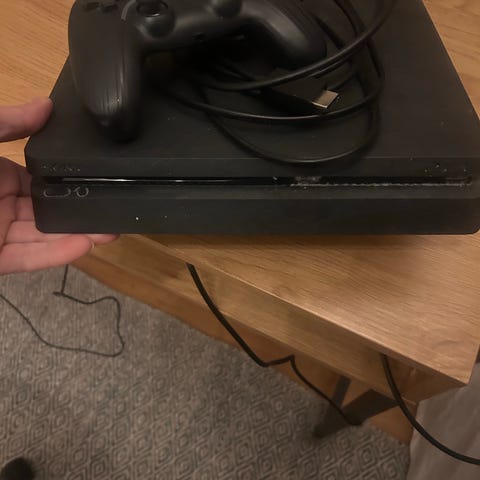 PlayStation 4 spelkonsol med tillbehör och spel. Konsolen är svart och används för att spela olika PlayStation 4-spel.