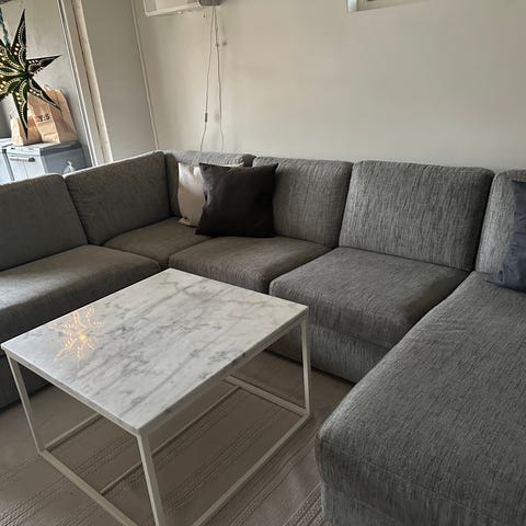 Säljer en tresitsig soffa med schäslong som är två år gammal inköpt på Mio möbler. Soffan heter Harper. Klädseln är i manchester och är i fint skick.