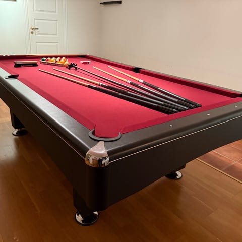 Kommer med 2 normalstora biljardköer, 1 mindre (chip/barn) kö, ett packet med 12 kritor, 1 triangel,