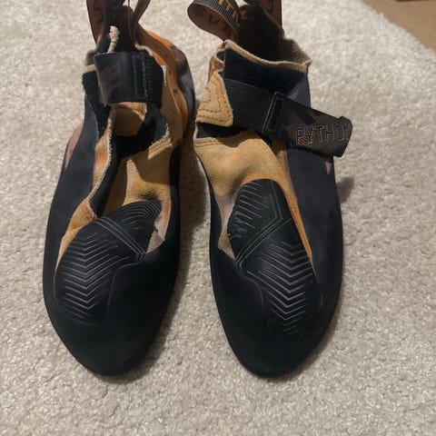 La Sportiva Skwama klätterskor i storlek 42. Skorna är svart och röda och är avsedda för användning inom klättring. De har en kardborreknäppning för justerbar passform.