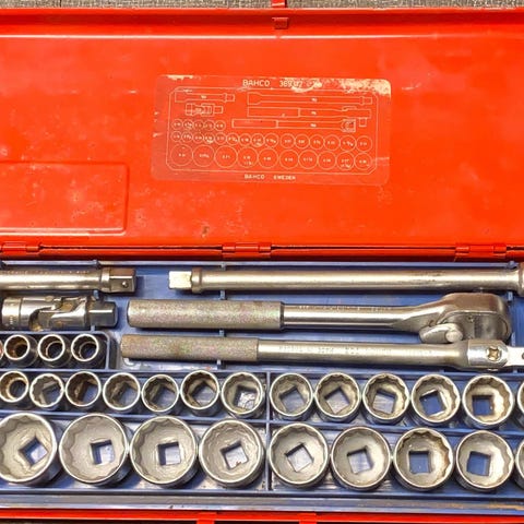 Bahco verktygssats 1759 i röd original verktygslåda i plåt. Innehåller blocknycklar, hylsor, spärrnyckel mm. Verktygen är i knappt använt skick. Vissa av verktygen är i helt oanvänt skick. Någon hylsa har små fläckar. Verktygssatsen är komplett med alla ingående delar. Schema finns i locket som visar vilka delar som ingår i verktygssatsen. Utseende, skick och ingående delar framgår av bilderna.