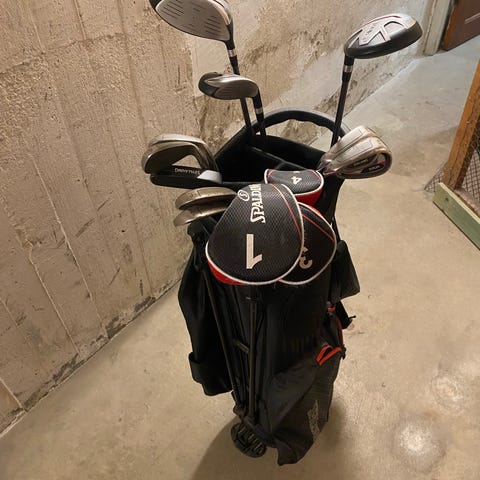Set med golfklubbor i olika märken och modeller. Innehåller olika typer av klubbor inklusive järnklubbor och putter. Klubbhuvuden i metall och skaft med grepp i olika färger. Passar för allmän användning inom golf.