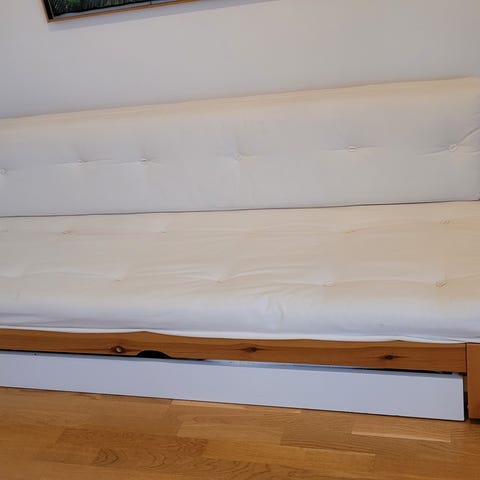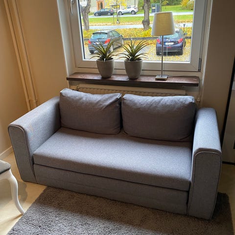Bäddsoffa Ikea PS med blå denimklädsel, avtagbar och tvättbar. Bäddmått bredd: 160 cm, längd: 200 cm. Lätt att fälla ut och ihop med hjälp av hjulen under. Sparsamt använd i gott skick.