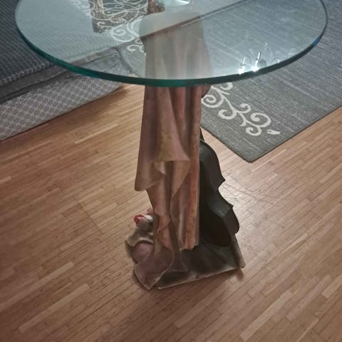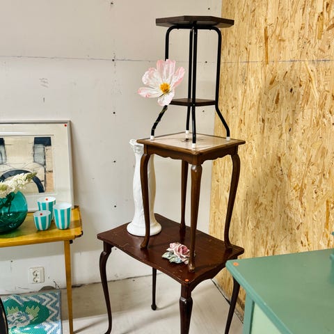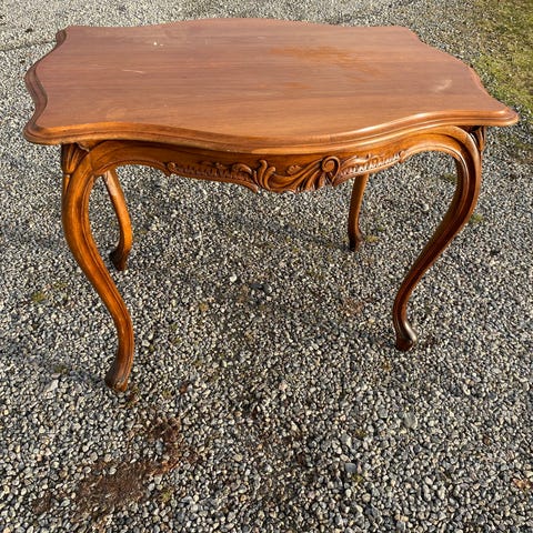 Träbord med snidade ben och rektangulär bordsskiva. Bordet har en naturlig träfinish och visar tecken på användning såsom repor och sprickor i träet. Passar som sidobord eller mindre avlastningsbord.