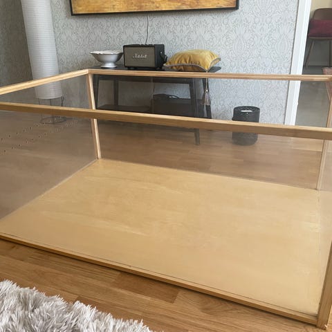 Praktisk bänk med två stora lådor på hjul undertill. Perfekta för foder och tillbehör. Har haft en stor hemmabyggd marsvinsbur på den.