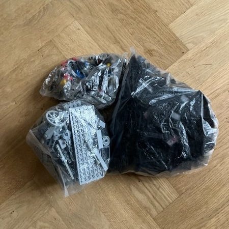 Ett stort sortiment av Lego-bitar i olika färger, sorterade i påsar. Inkluderar även några basplattor. Ca 1,6 kg