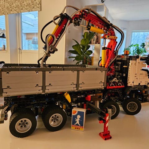 LEGO Technic bandvagnsmodell (42140) med medföljande instruktioner. Modellen är komplett och alla bitar finns. När racerbilen möter en vägg vänder den upp och ner och blir en lastbil. Radiostyrning via bluetooth och en app.
