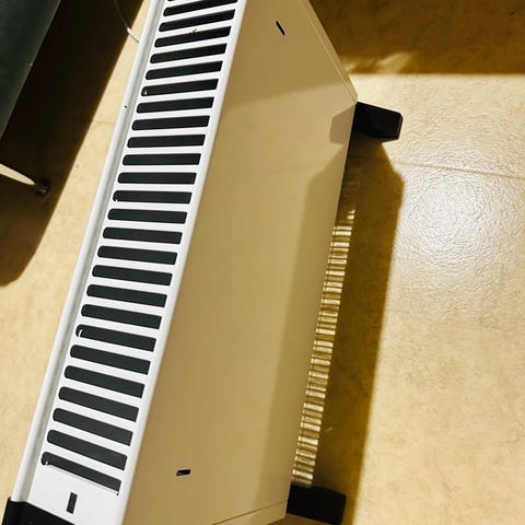 Anslut 3 kW värmeelement med svart och gul färg. Utrustad med två vred för inställning av värme och fläktfunktion. Designad för inomhusbruk med skyddsgaller fram.
