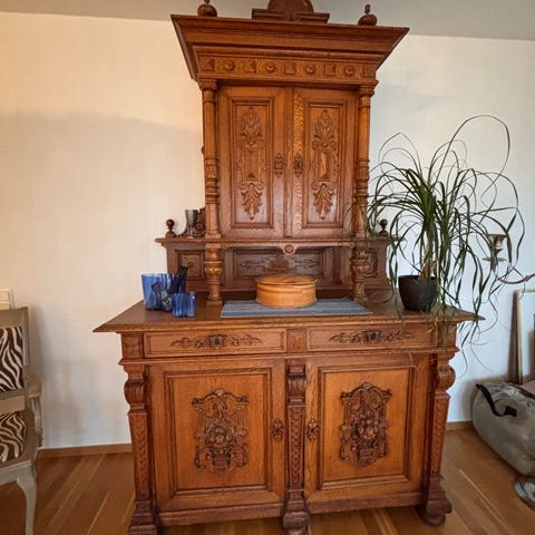 Antikt vackert skåp med fina detaljer så som porslinsknoppar. Behöver lite färg och omtanke för att åter glänsa som den pärla den är.