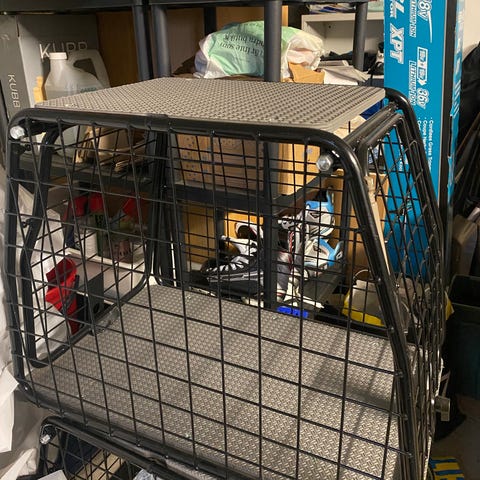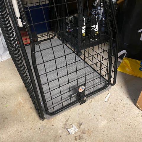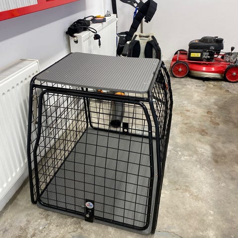 Buren är utrustad med lås och inkluderar tillbehör som nycklar och fästanordningar och 2 st koppelkrokar. En är monterad på buren och är svart sprayad och en är kvar i kartongen ( osprayad ). Finns dyna till den också som medföljer.