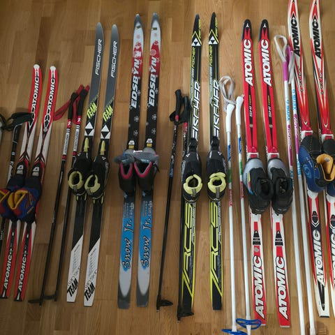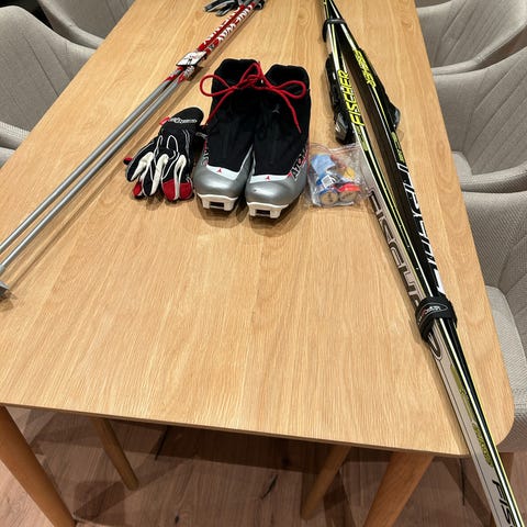 Pris för skidor, pjäxor och ett par stavar 675kr