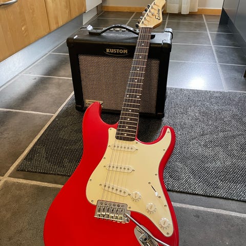 Cruiser Elgitarr med standard design och sex strängar. Gitarren har en mörk finish och är utrustad med justerbara stämskruvar och pickups. Inkluderar en förstärkare med flera reglage för volym och tonkontroll, samt anslutningsmöjligheter för olika ljudinställningar.