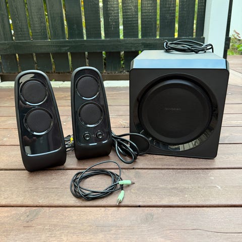 Datorhögtalare med 2.1 system, dvs två högtalare och en subwoofer.