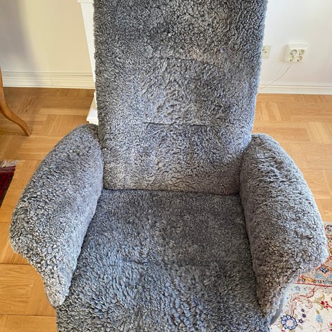 Säljer två stilrena stolar med armstöd i ljus träfinish, beige klädsel och helt nya och oanvända fårskinn (ej äkta).