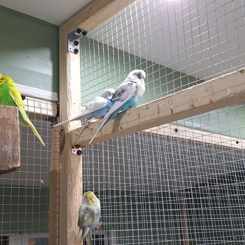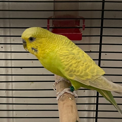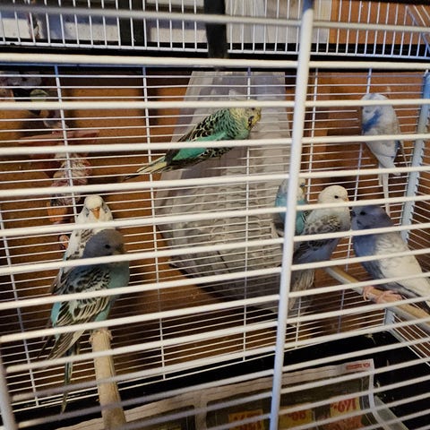 Två undulater säljes med allehanda tillbehör; bur, leksaker, lampa, resebyrå m.m