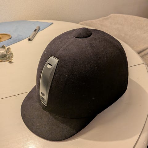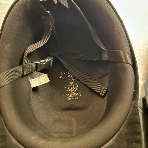 Ridhjälm av märket Horka. Storleken är 54cm i huvudomfång eller 6 5/8. Hjälmen är använd men fortfarande i ok skick.
