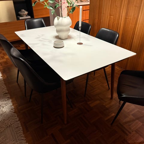 Fint och praktiskt matbord, skiva: vit fenix laminat med vitlackerad stålben.